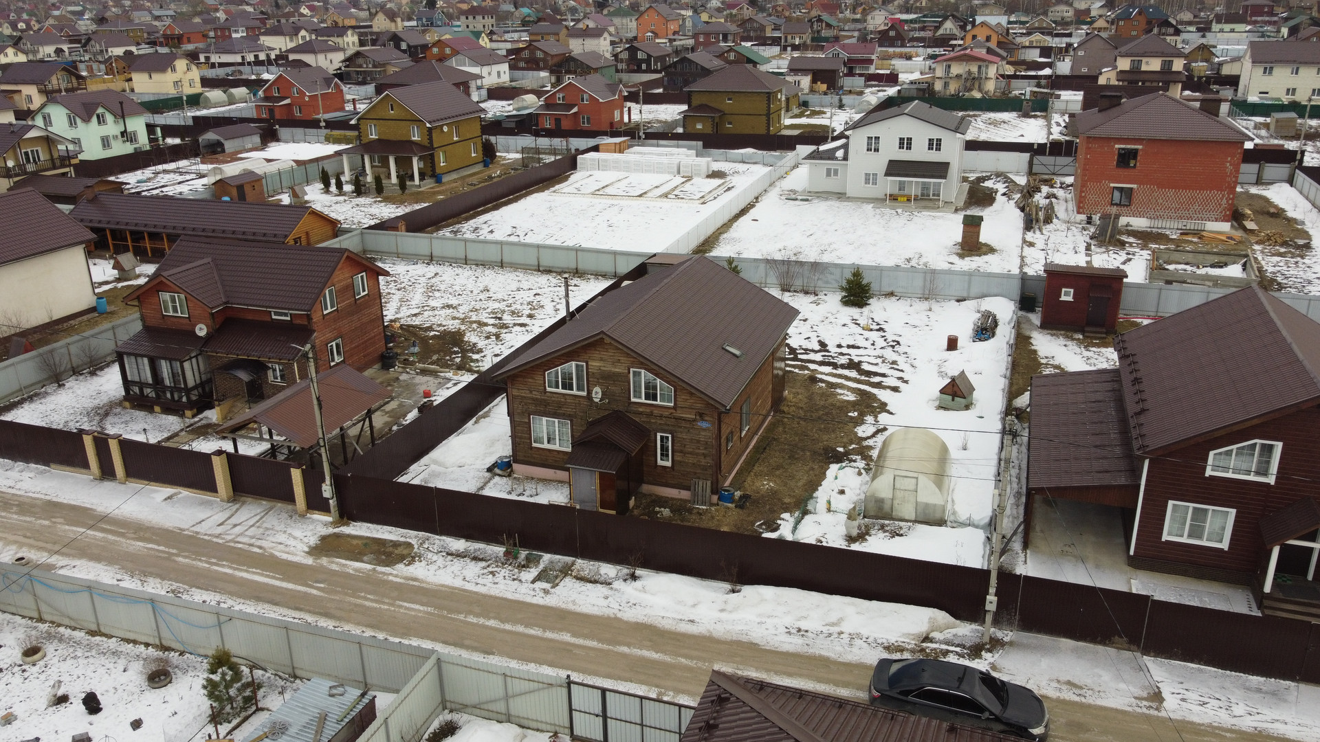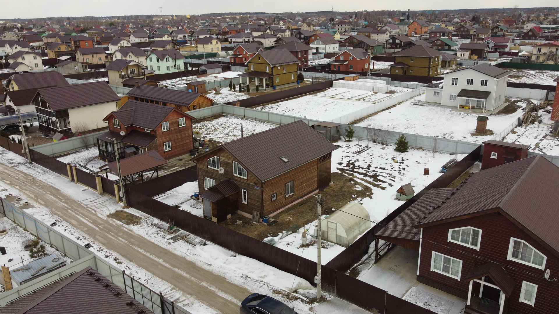 В поселке есть магазины, строительный рынок, автобусные остановки.