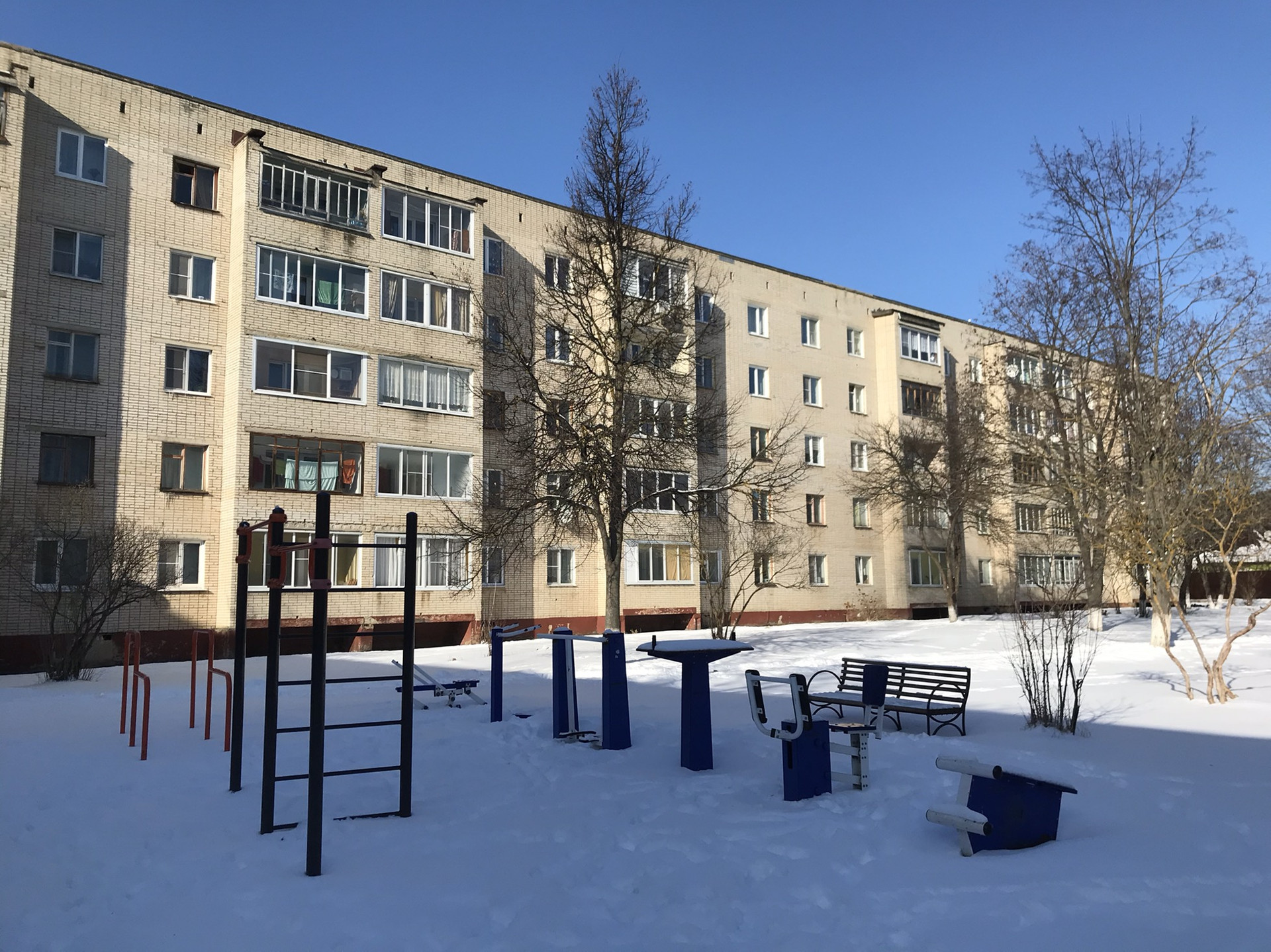 - во дворе прям спортивный комплекс для занятий на тренажерах на улице.