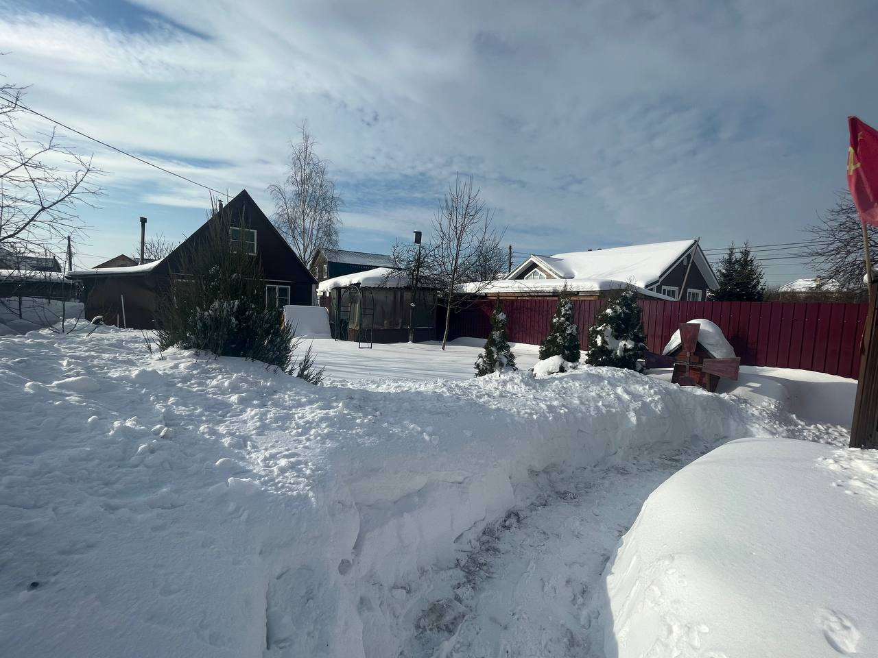 Участок правильной формы, сухой, огорожен забором из профнастила. Откатные электрические ворота. Также на участке имеется навес 6,5*11м для 4 автомобилей, беседка. Территория облагорожена и ухожена.