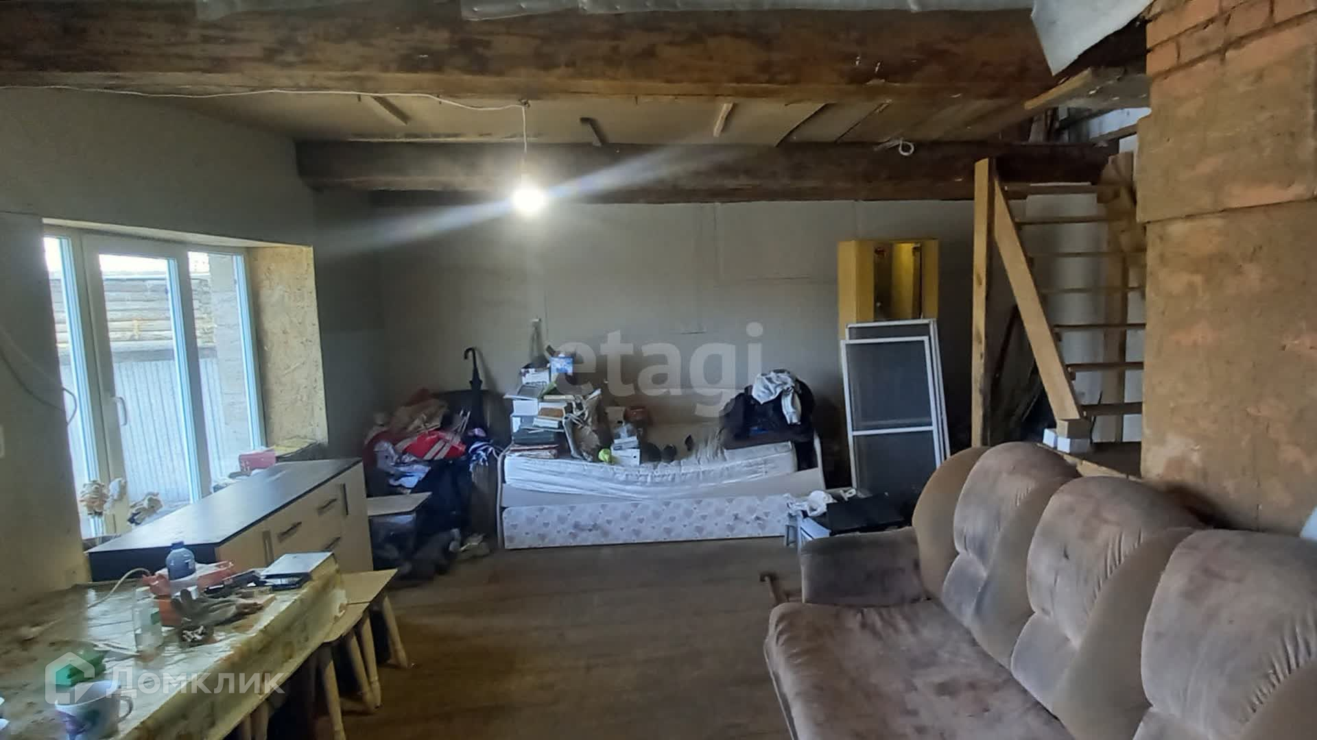 Дом требует внутренних работ, но уже частично оборудован пластиковыми окнами. Первый этаж включает в себя прихожую, просторную кухню-гостиную с туалетом, а на втором этаже расположены две уютные комнаты и второй санузел.
