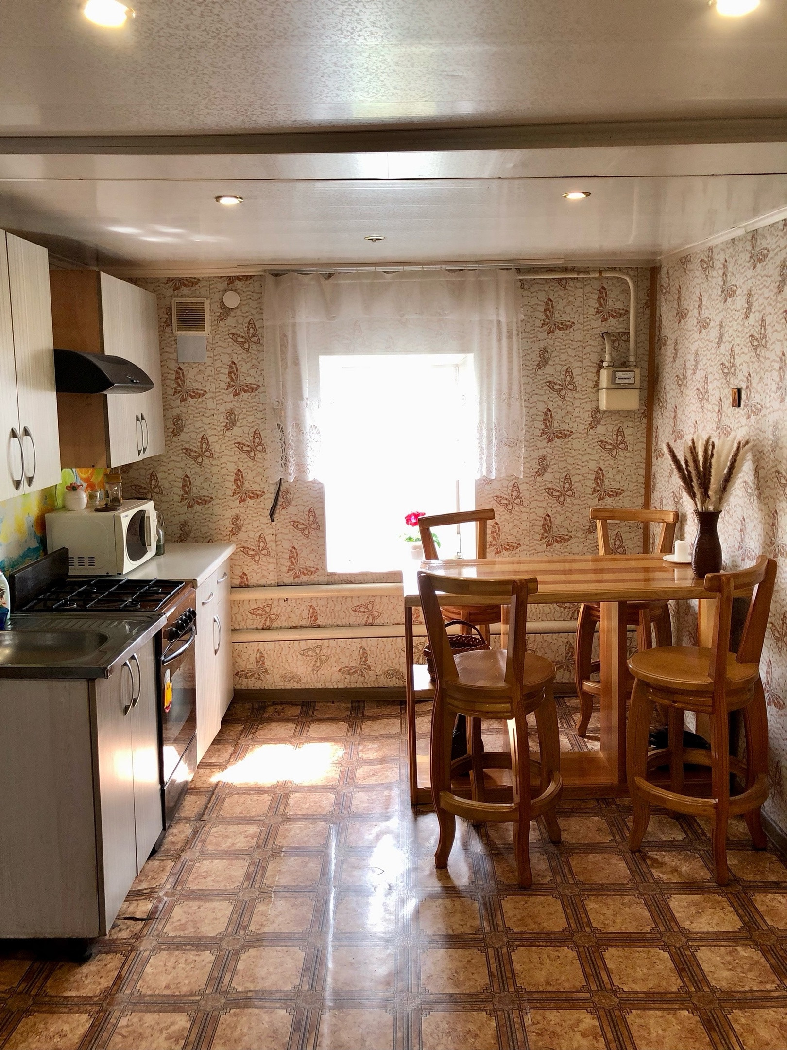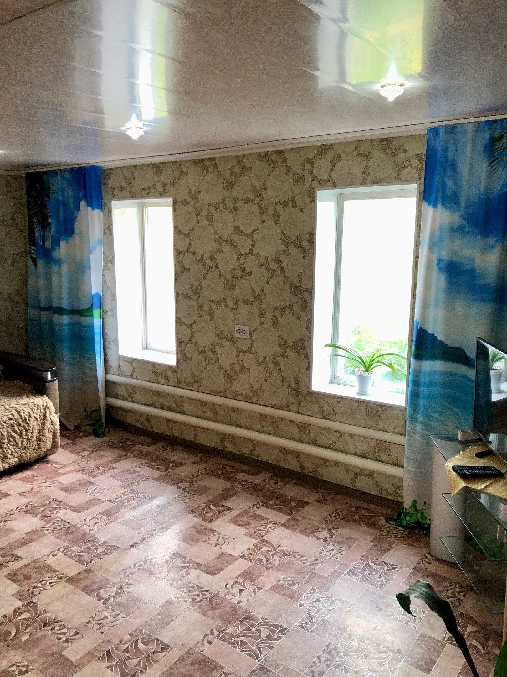 Дом обеспечен питьевой водой из центрального водопровода. В доме газовое отопление, установлен котeл гaзoвый "ARDERIA" двухкoнтуpный, дополнительно установлен водонагреватель на 40 литров. Покрытием пола линолеум. Потолок панели, точечное освещение. Ванная комната и туалет панели, электричество 220 В. Канализация септик.