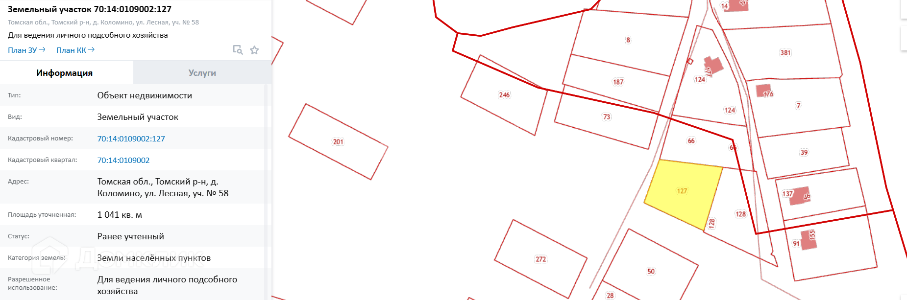 Томская обл., Томский р-н, д. Коломино, ул. Лесная, уч. № 58. Площадь уточненная: 1 041 кв. м.