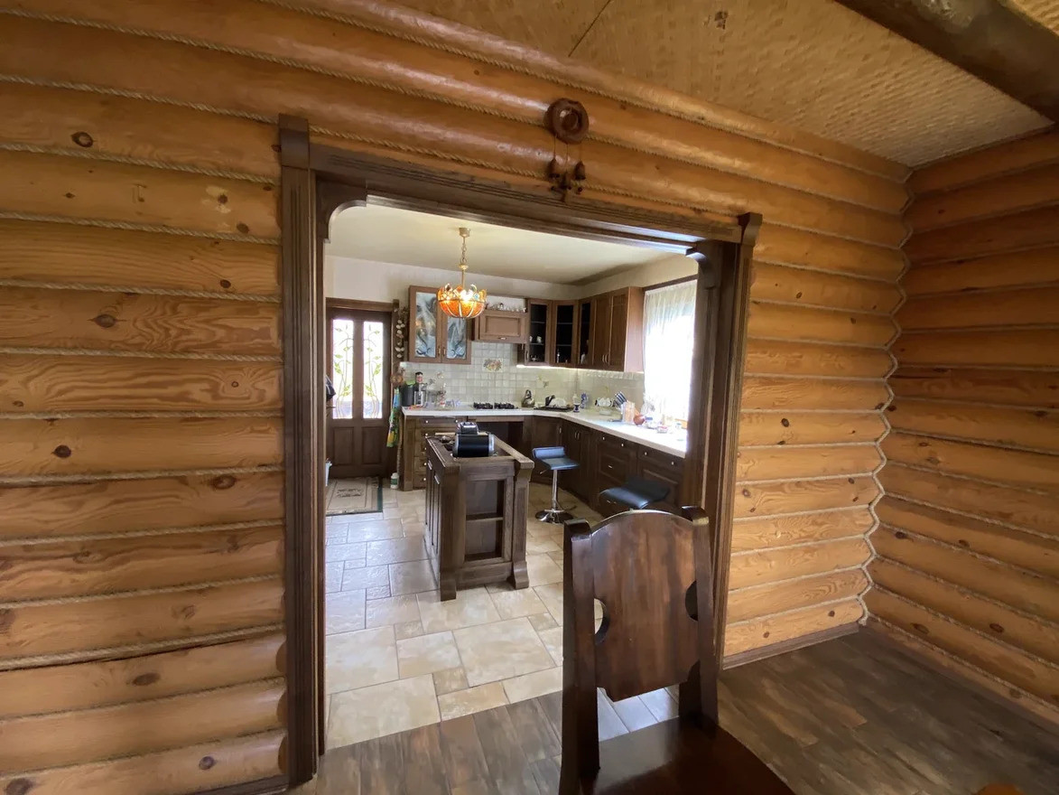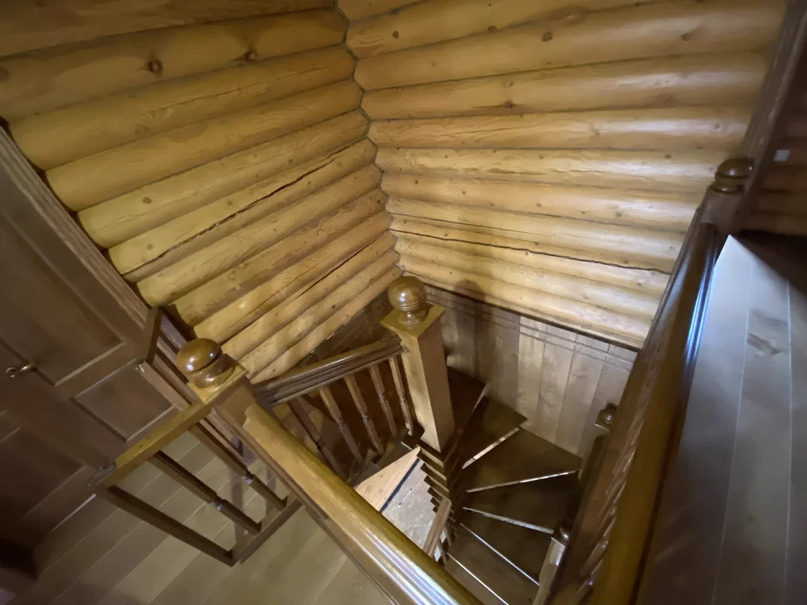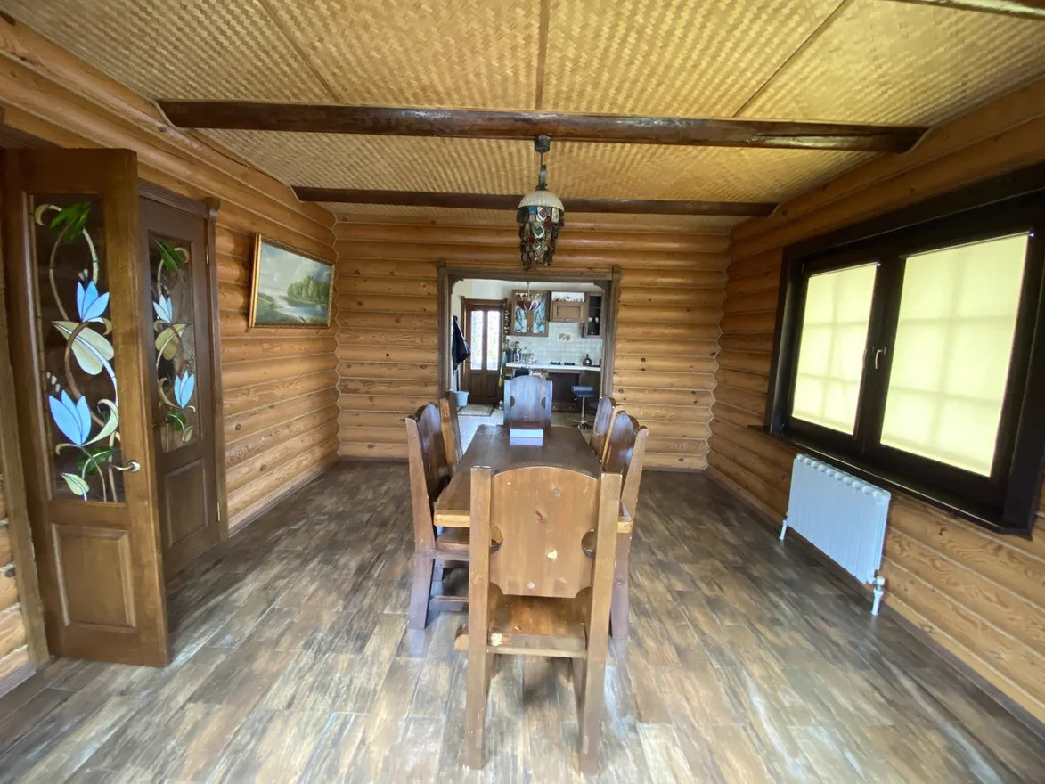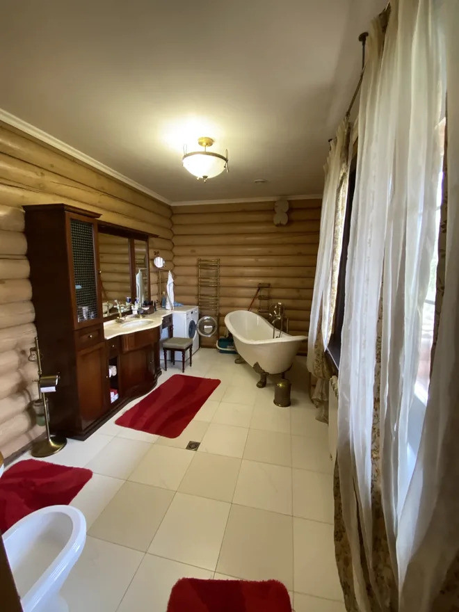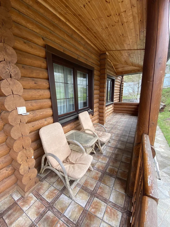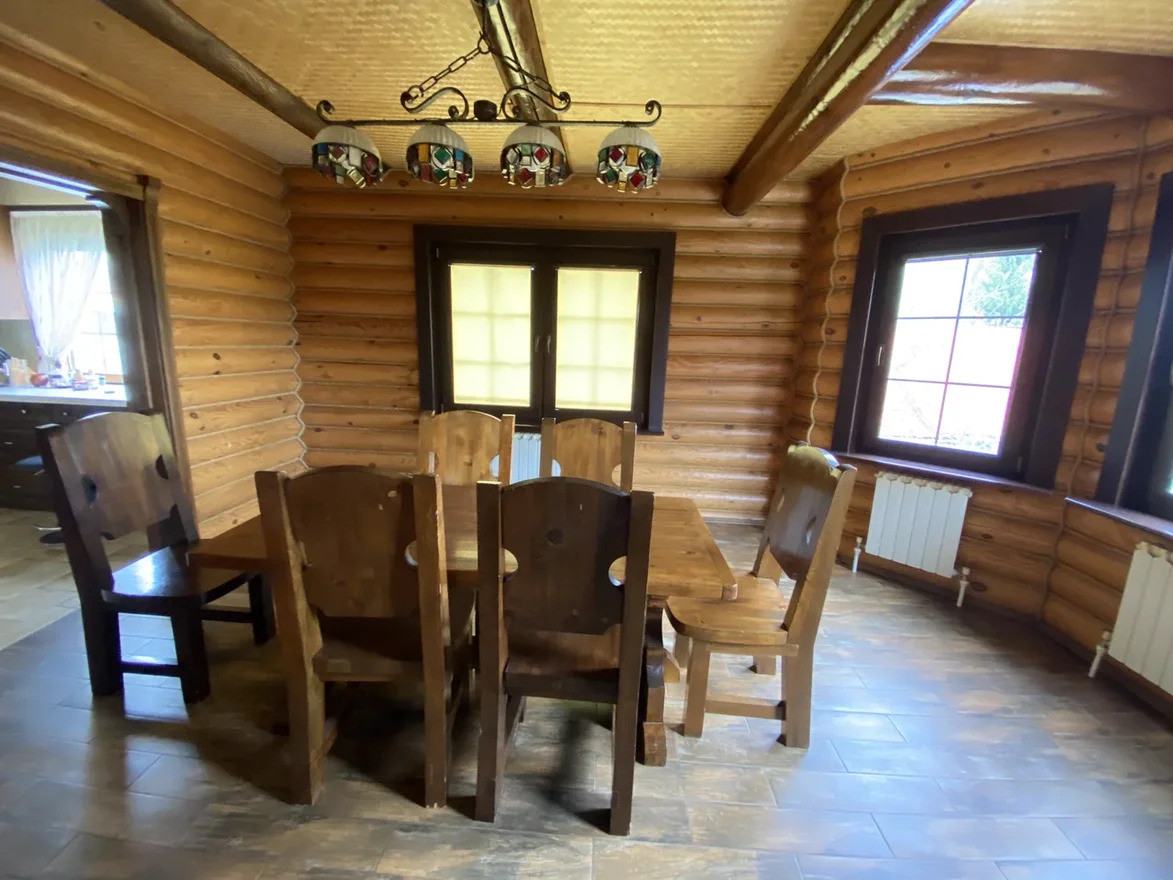 Жилой дом построен из обработанного оцилиндрованного бревна Карельской сосны. На первом этаже дома находится кухня, столовая, гостинная с камином из натурального камня, зимний сад, ванная комната с техникой Villeroy & Boch, Miele и коридор-гардеробная. Под плиткой установлен тёплый пол. На внутреннюю часть дома выходит открытая веранда.