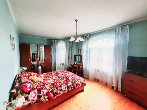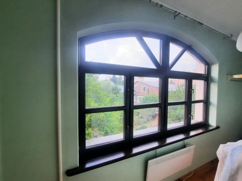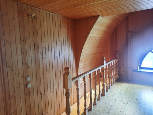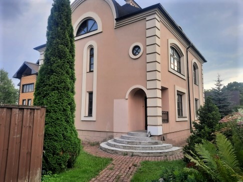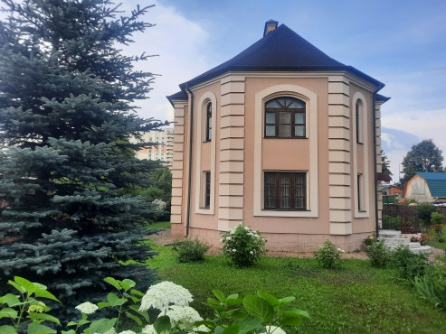 Фасад дома окрашен в бежево-розовый оттенок с декоративными элементами, имеет 2 входа с разных сторон, окна с двойными деревянными стеклопакетами и арочными сводами, крыша утеплена двойным слоем урсы и покрыта мягкой кровлей Katepal (пр-во Финляндия), фундамент монолитный с цокольным этажом, имеется большая мансарда - отделана вагонкой, перекрытия между этажами ж/б плиты, потолки 2,80 м, отделаны гипсокартоном.