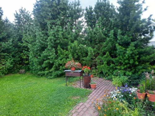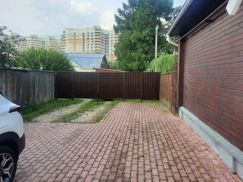 Заезд к дому выложен тротуарной плиткой с парковочным местом на 4 автомобиля. На участке растут ели, сосны, орешник, туи, садовые цветы, плодово- ягодные кустарники. Забор смешанный: металлический штакетник и деревянный.