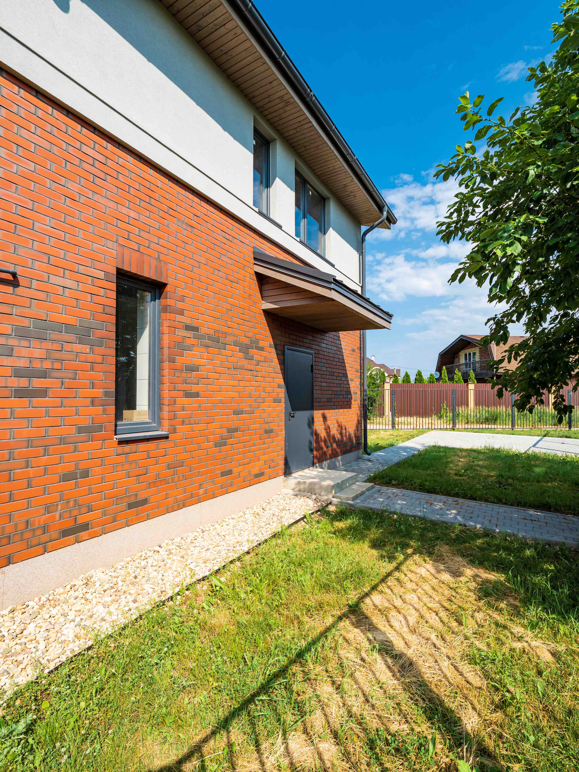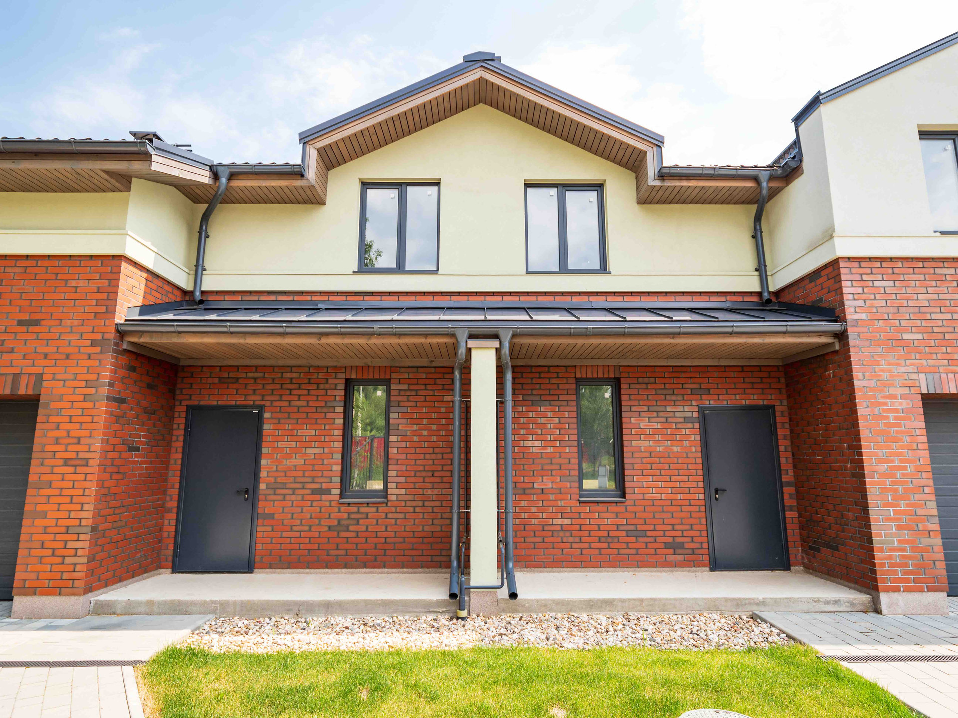 В строительстве применялись только лучшие материалы и технологии высокого качества, которые прослужат долгие годы. В отделке наружных стен использованы декоративная штукатурка и клинкерный кирпич, кровля изготовлена из металло-черепицы и представлена многослойным пирогом.