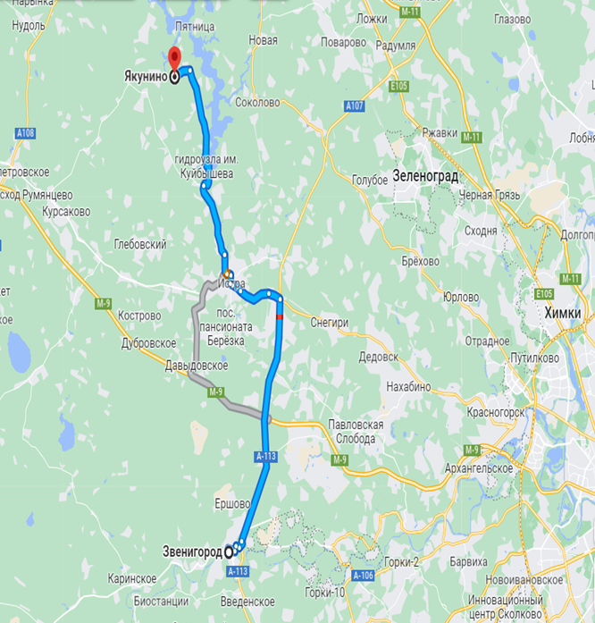 Поликлиника в г. Истра. Асфальт до поселка. Автобусная остановка «Якунино» в 300 м. По границе поселка протекает р. Чернушка. Истринское водохранилище в 3 км от поселка, места для купания и пляж.