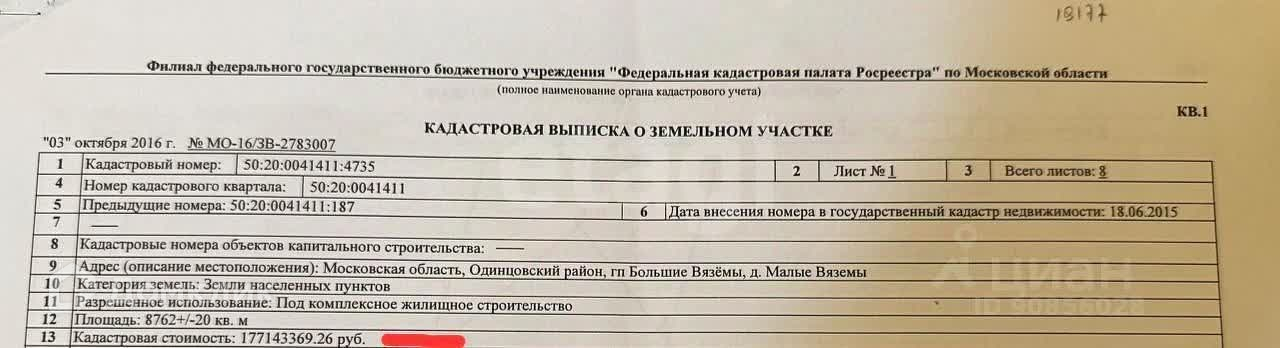 Срочно! Продается участок в Одинцовском районе, под строительство торговых помещений, площадью 87,62 соток. Участок в собственности, прямоугольный, правильной формы, расположен на въезде в строящийся, новый, современный микрорайон. Участок ровный, сухой, граничит с строительным рынком, пятерочкой и заведениями общепита. Категория земель - Земли населенных пунктов. Виды разрешенного использования - Под комплексное жилищное строительство. ( можно строить высокоэтажки). С возможностью строительств торговых площадей. Электричество 150 кВ, с возможностью увеличения. Газ по границе участка. Торг. Номер в базе: 884623