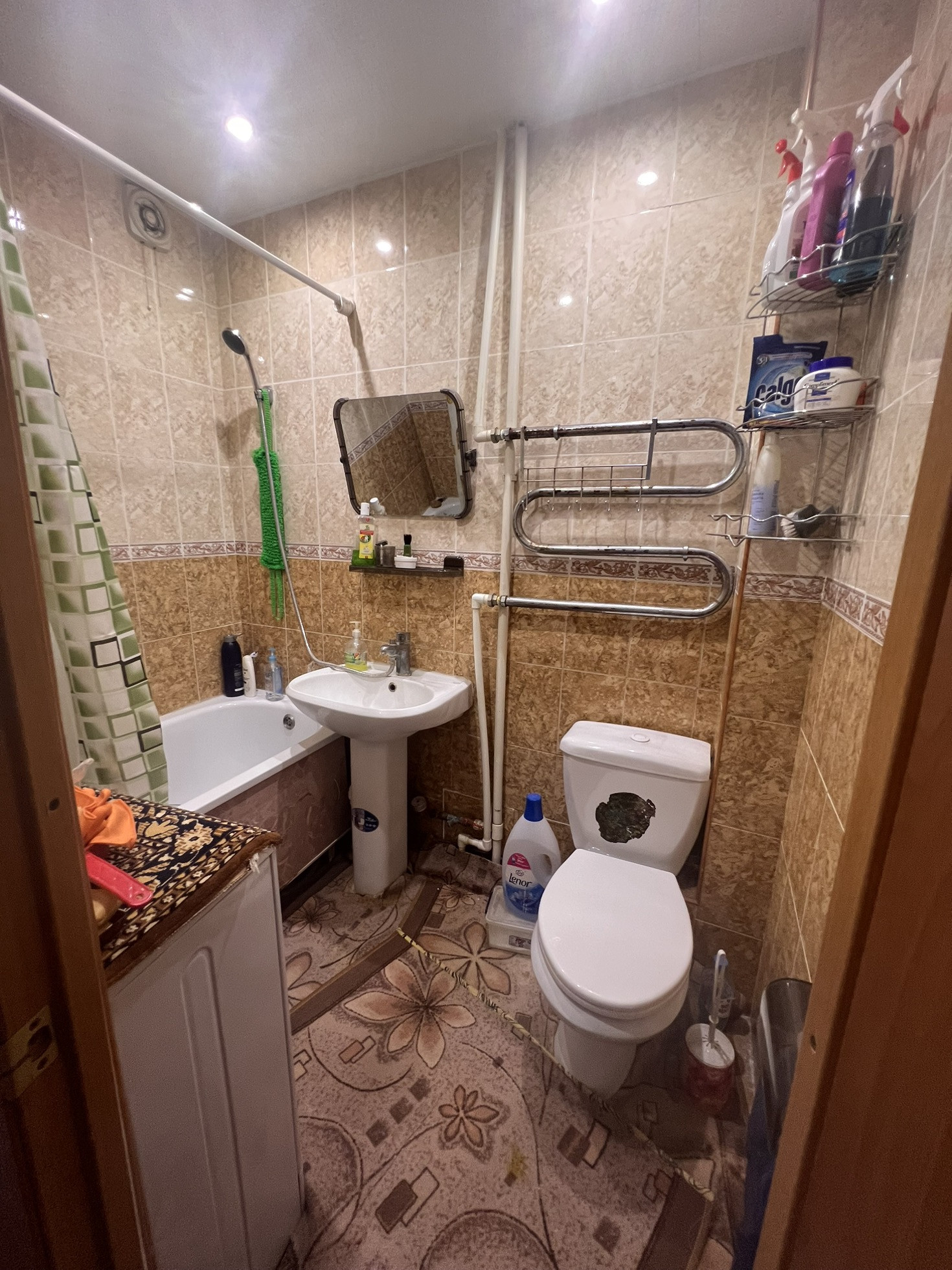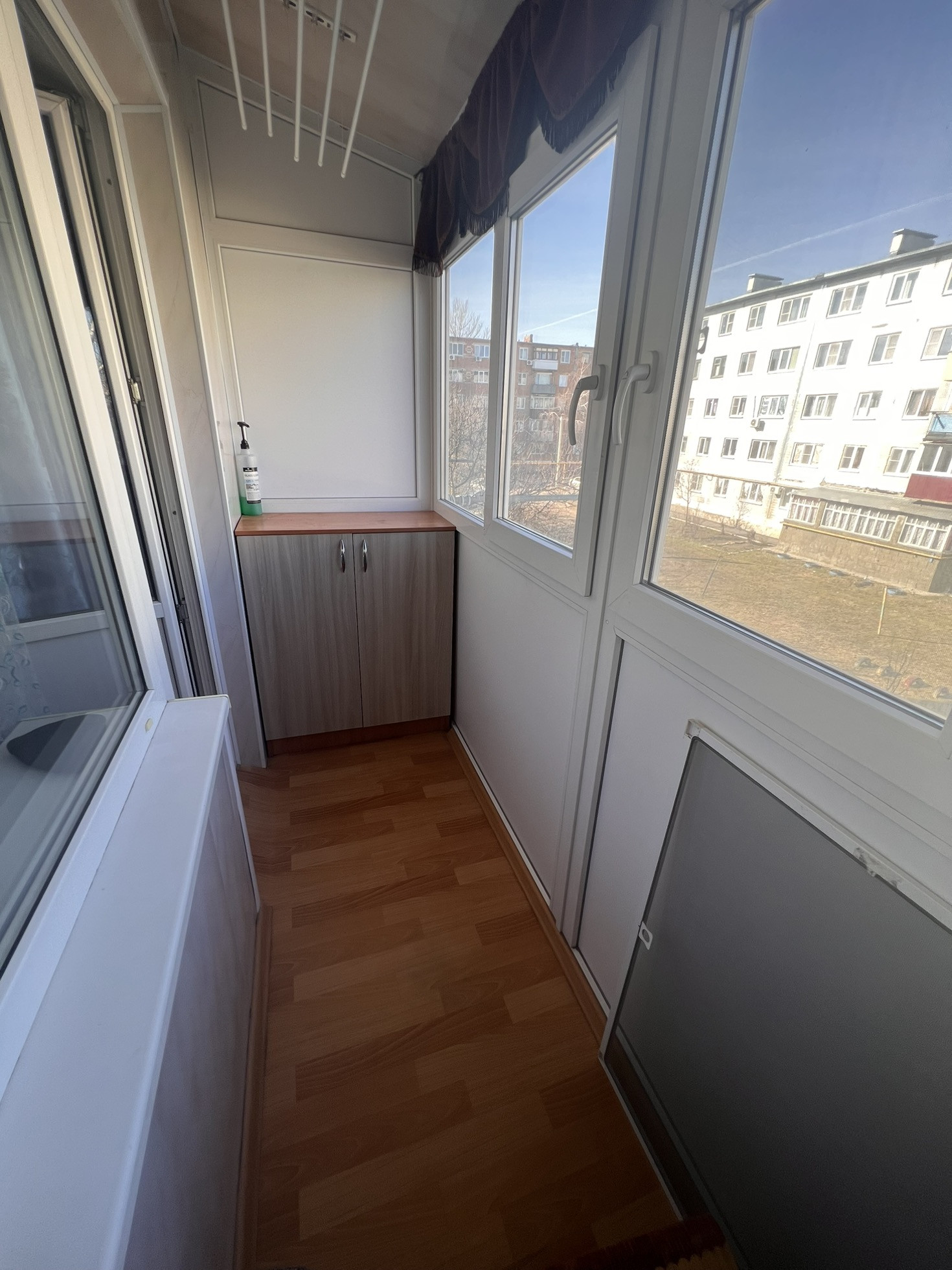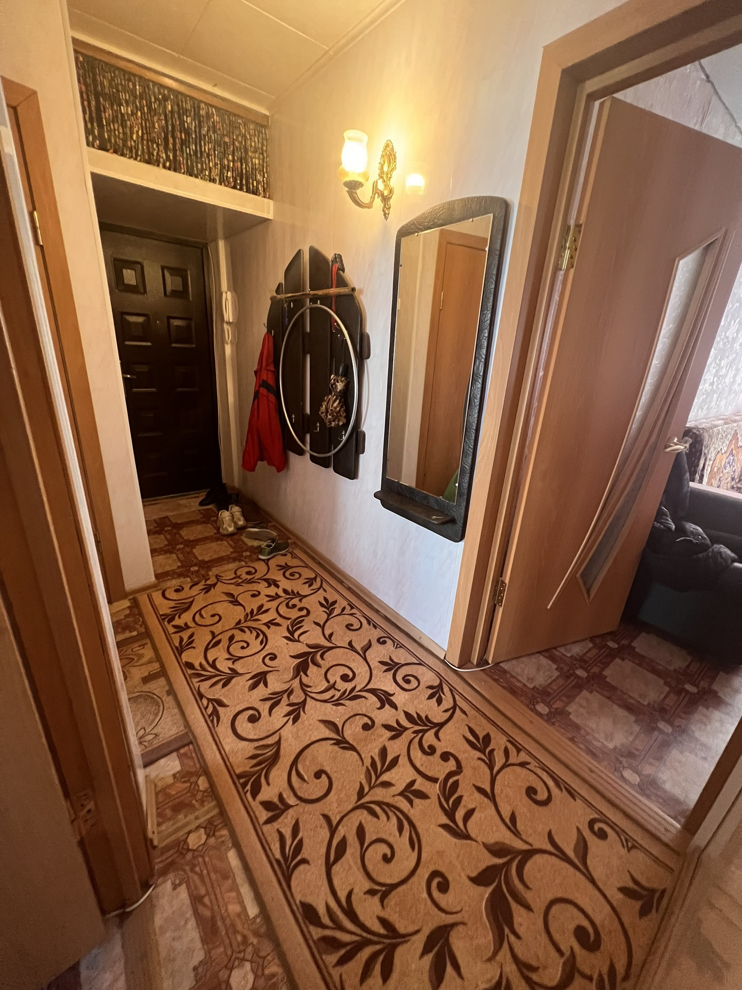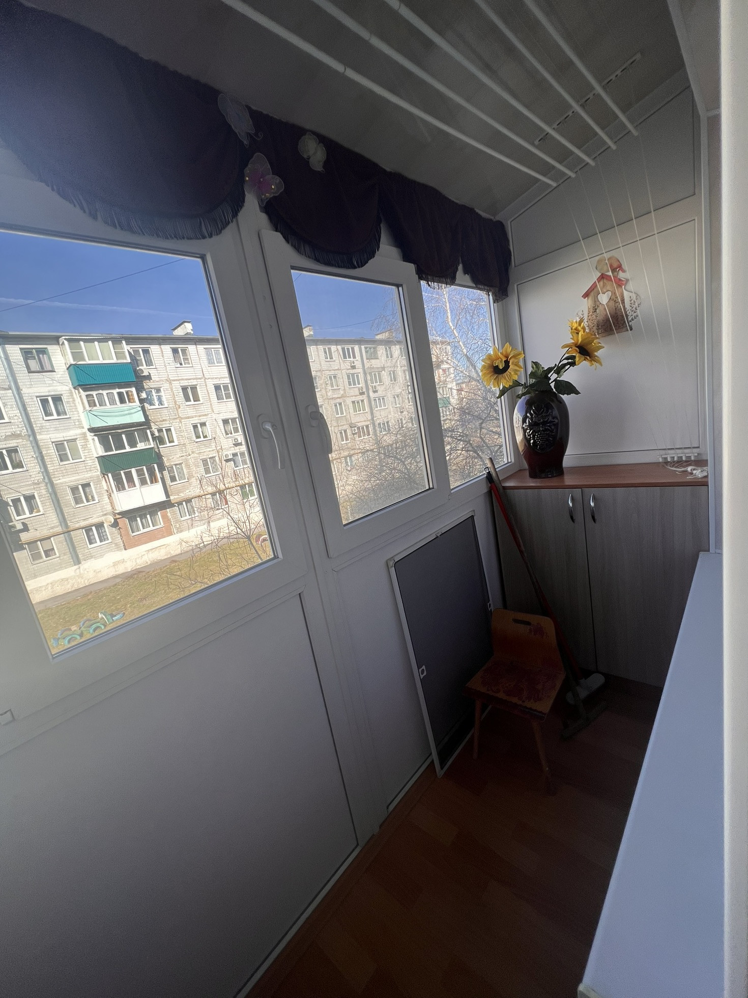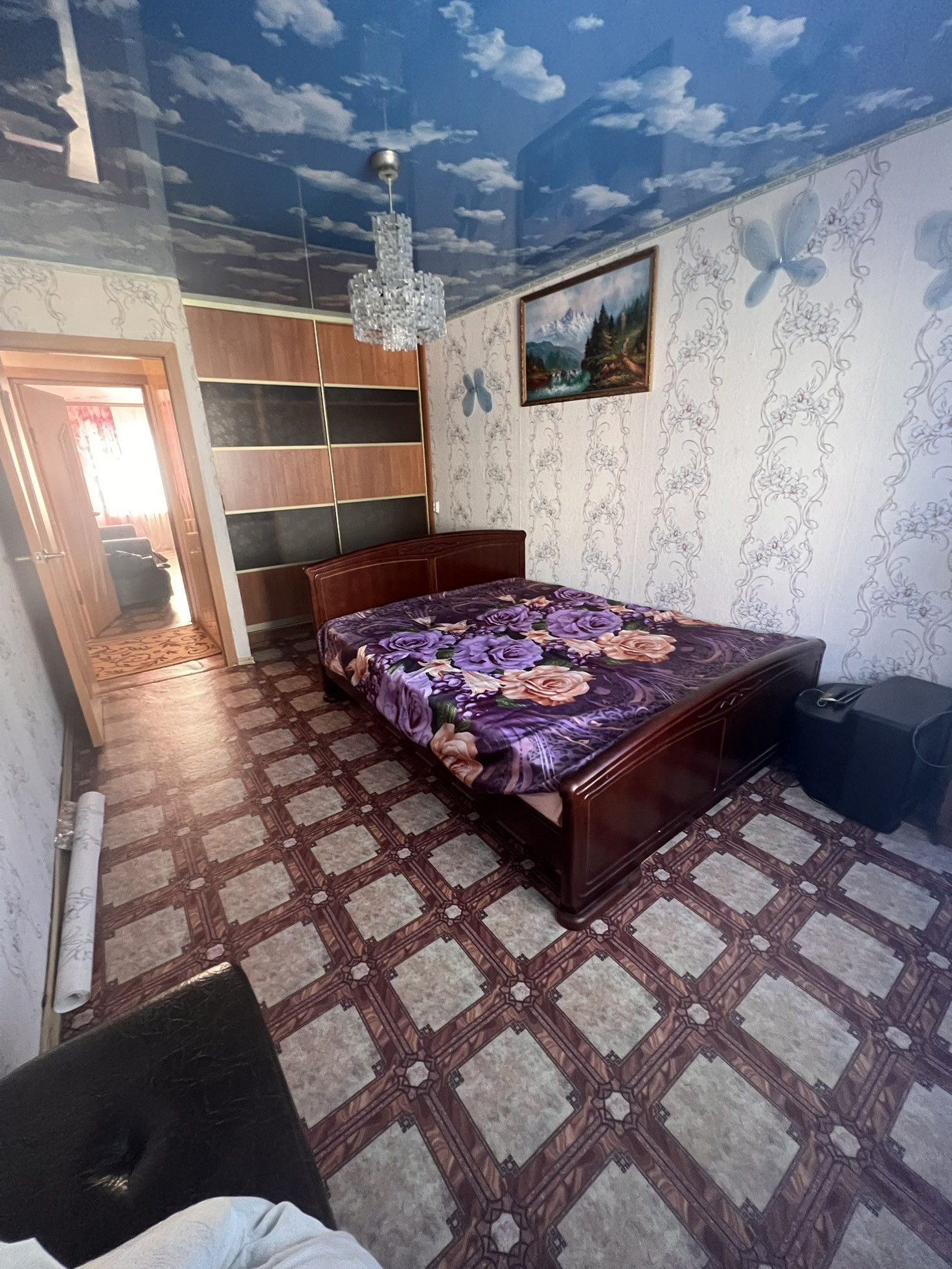 Окна выходят как во двор, так и на другую сторону , самое удобное расположение комнат ( бабочка) , сан узел совмещен, полностью плитка, натяжные потолки , на полу в комнатах линолеум, металлопластиковые окна, новая газовая колонка, новая газовая плита, на все стоят счётчики, балкон застеклен, два встроенных шкафа, мебель остаётся частично по договорённости, стиральная машинка,2 телевизора, даже немного посуды ,если нужно, состояние, заходи и живи.