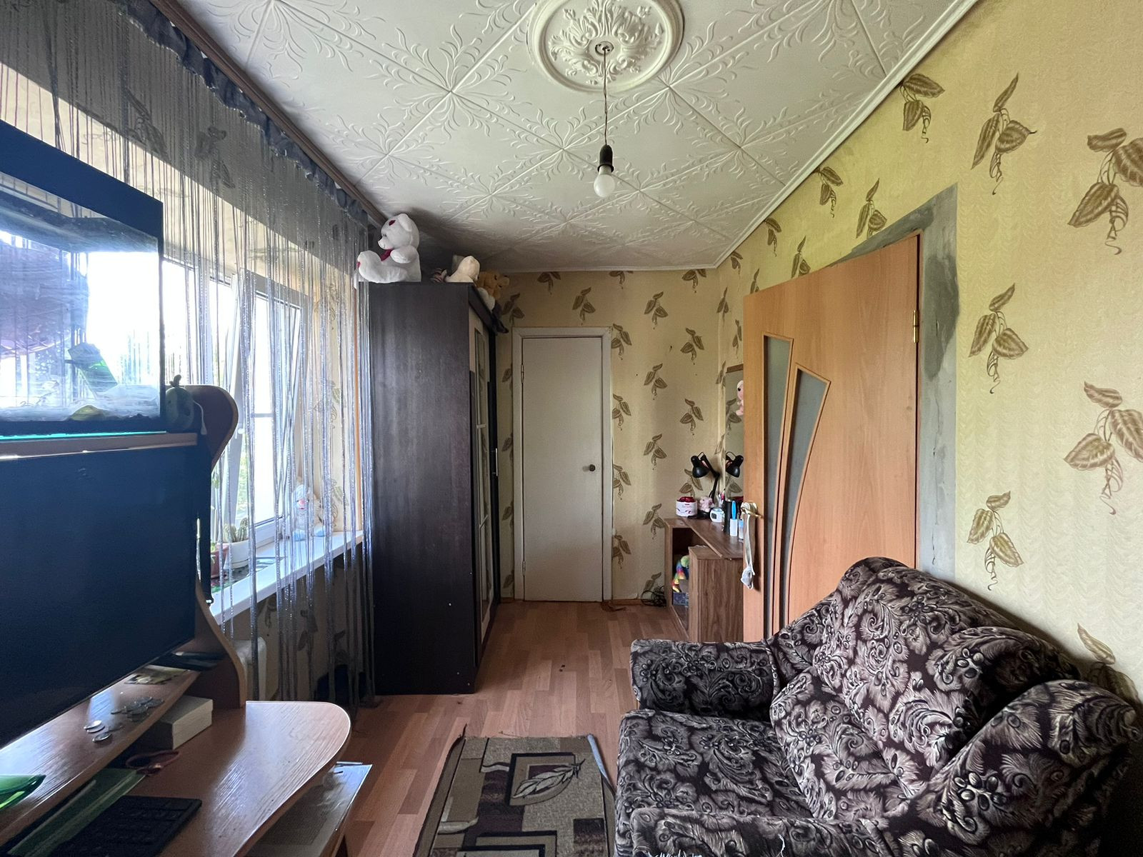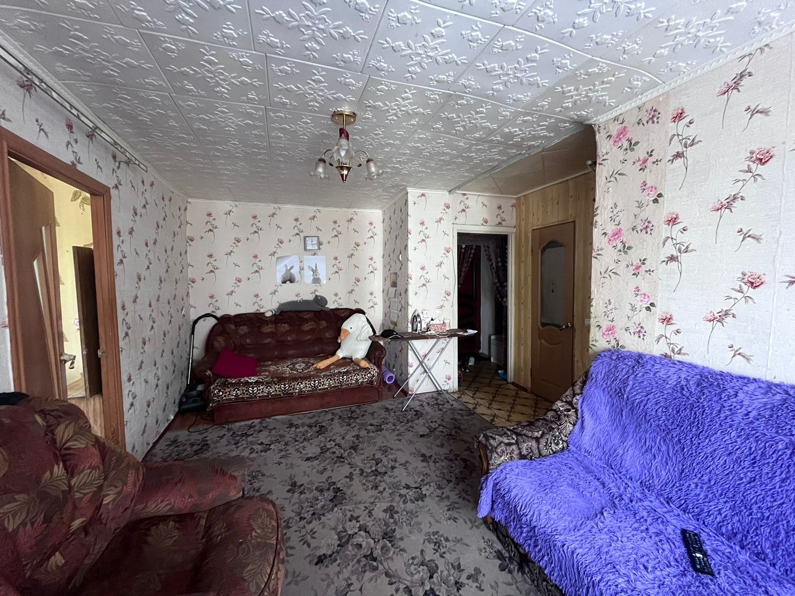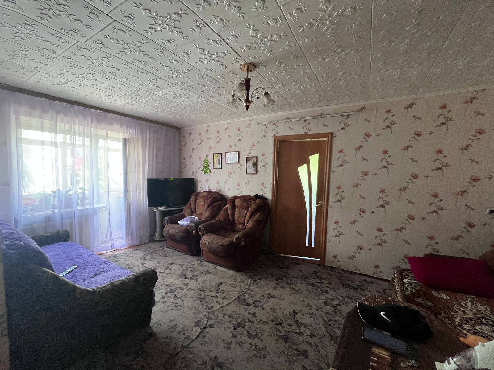 На потолке во всех комнатах плитка ПВХ, на полу линолеум, на стенах-обои.