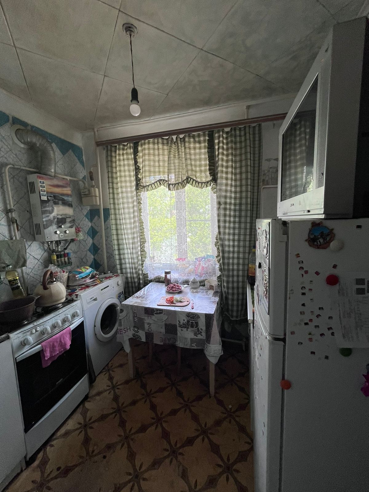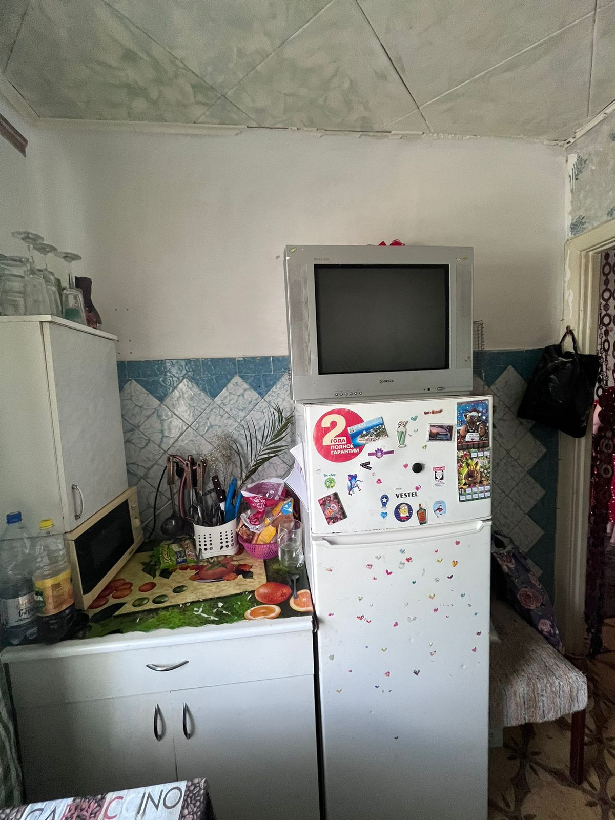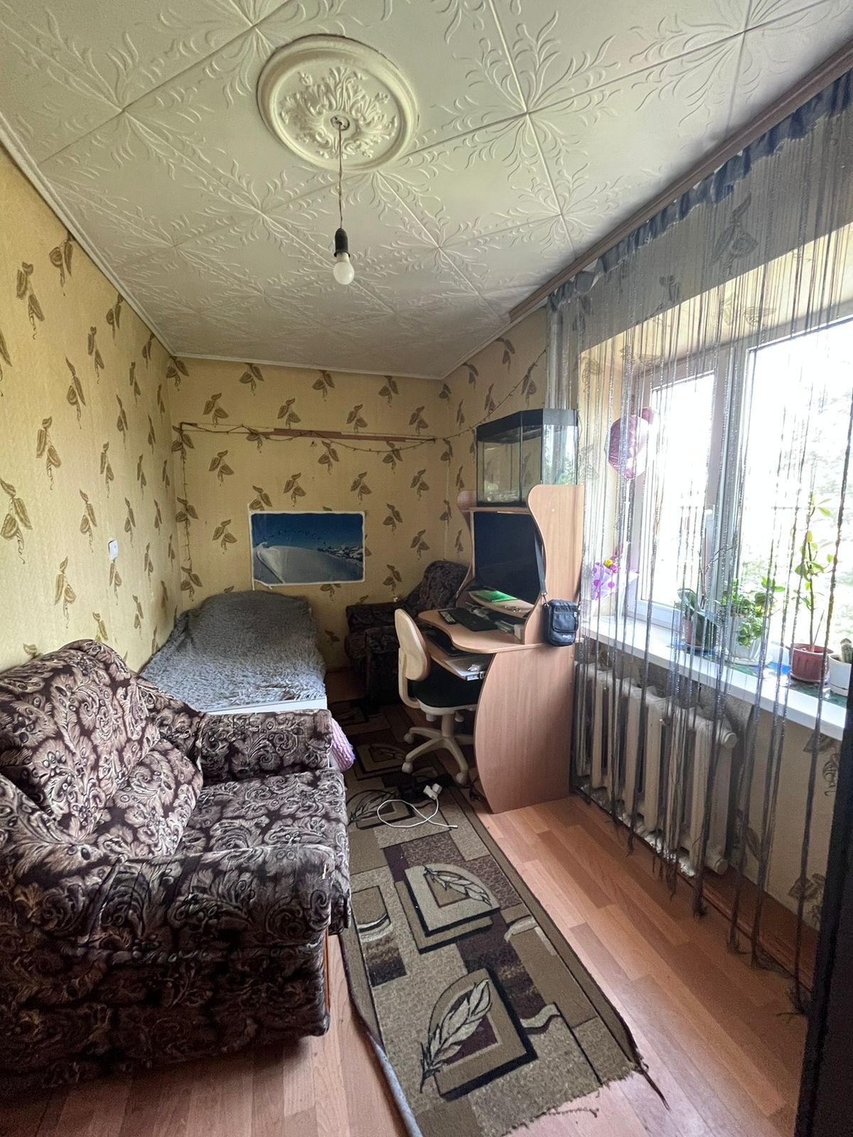 На потолке во всех комнатах плитка ПВХ, на полу линолеум, на стенах-обои.