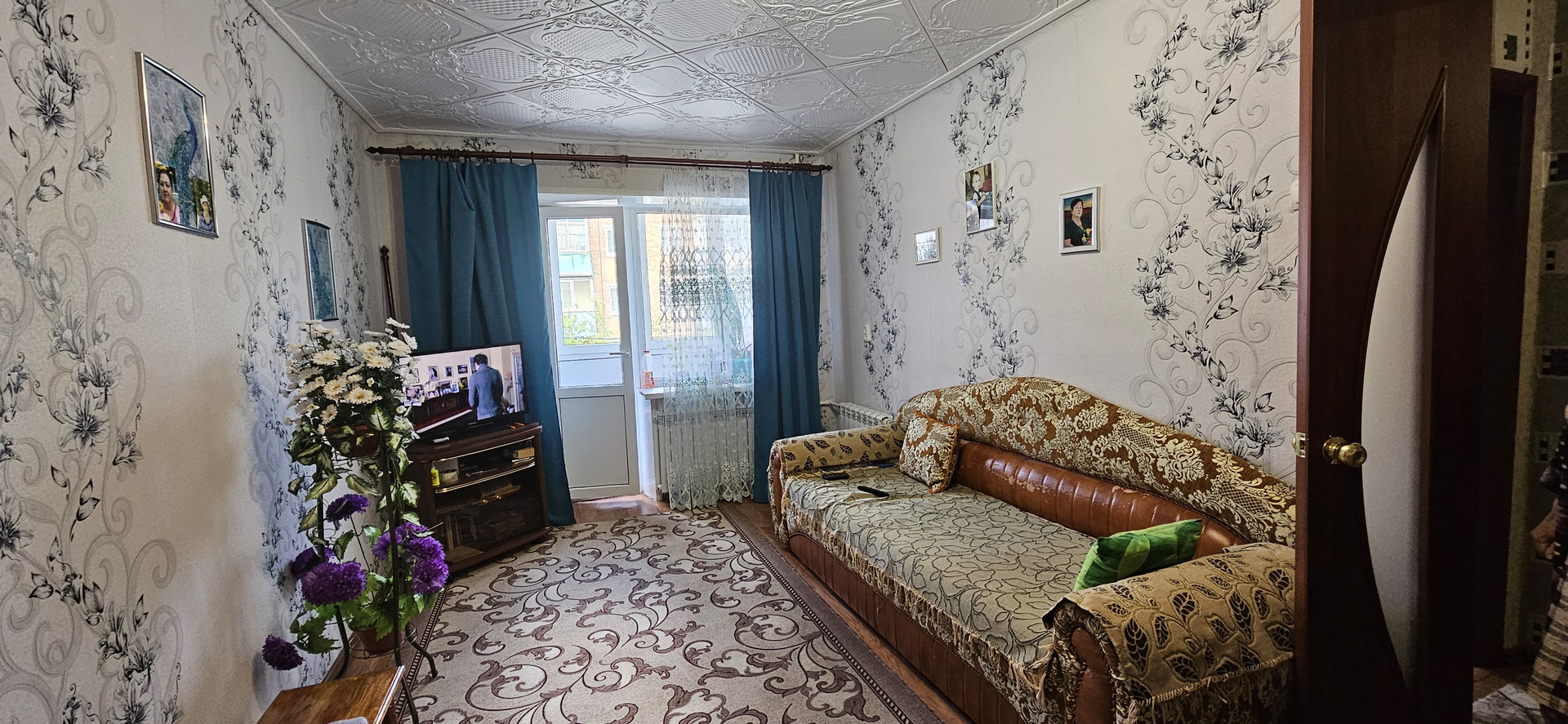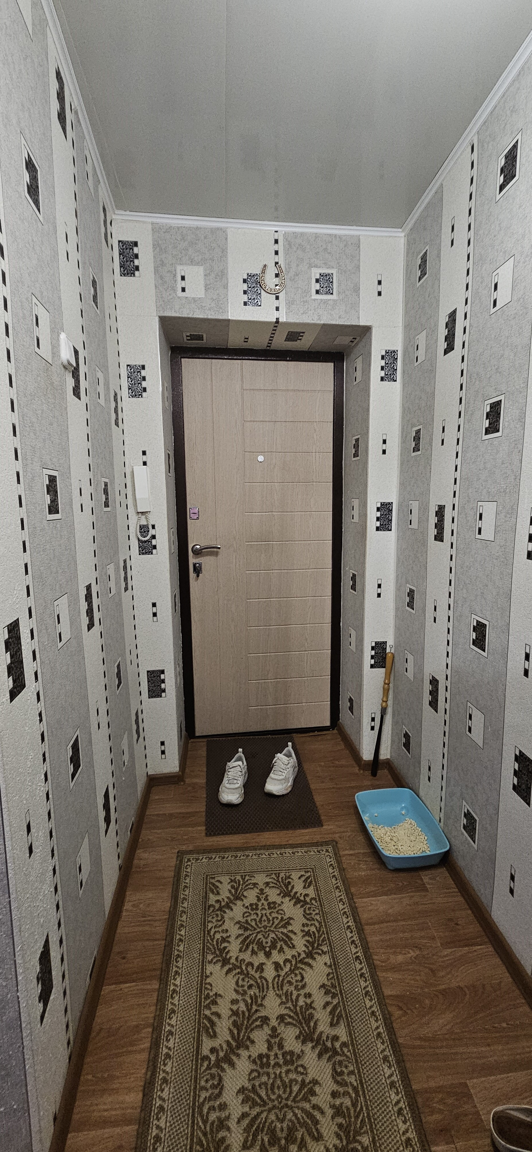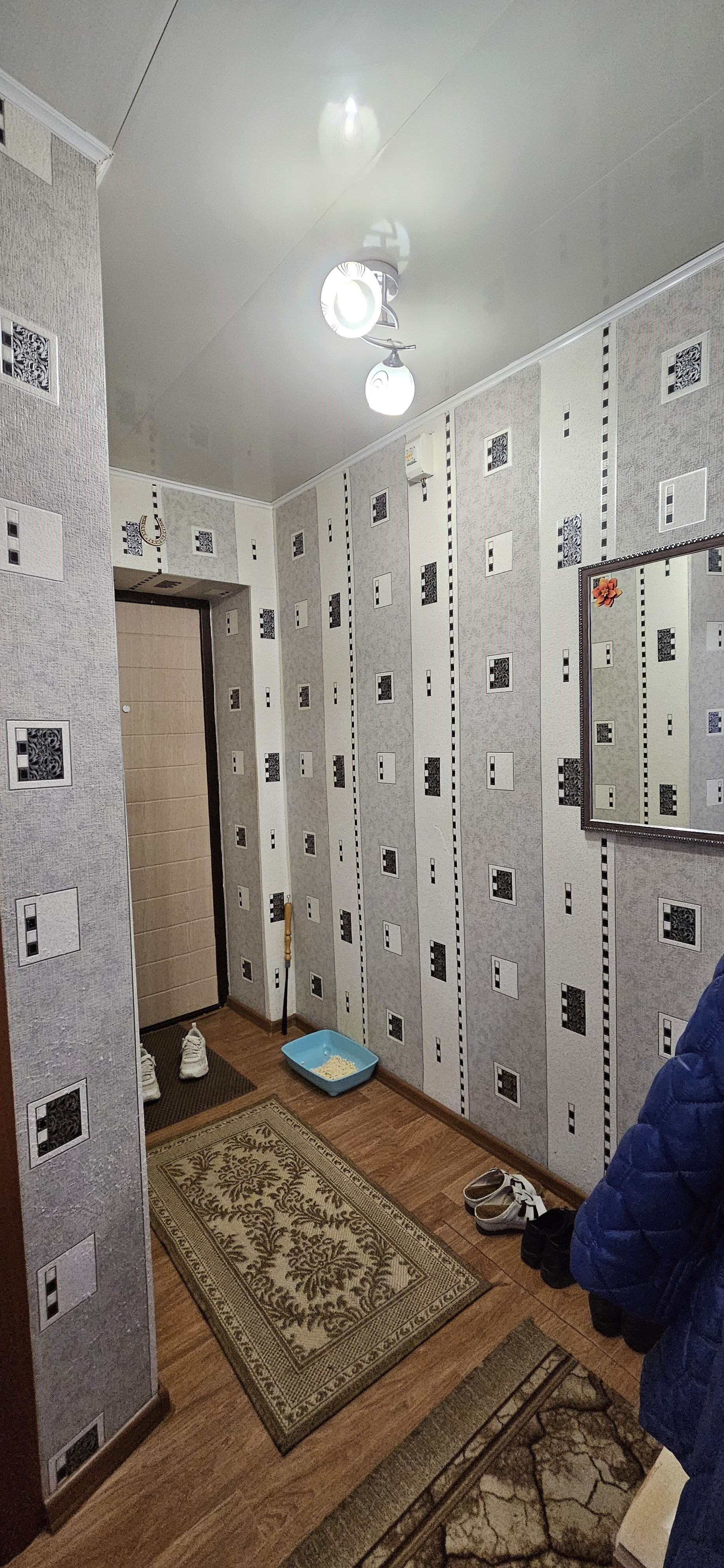 В квартире стены оклеены обоями, на полу линолеум, на потолке плитка ПВХ. Установлена новая железная входная дверь.